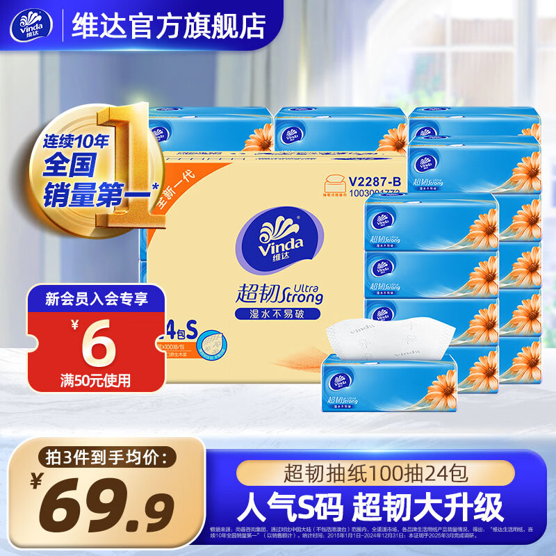 维达 超韧系列 抽纸 3层*100抽*72包(195*133mm) 124.7元