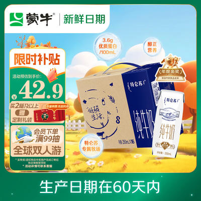 蒙牛 全脂 利乐砖 纯牛奶 3.2g蛋白质 250ml 16盒 1.6元/盒,53.8元(需领券,合26.9元/件)
