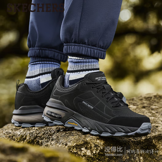 斯凯奇 岚霖 男子耐磨登山徒步鞋 ,货号:237672, 全掌GOODYEAR固特异橡胶大底,增强耐磨抓地性,4MM深人字形大底咬花,适配户外全地形。MAX PROTECT环抱式TPU,后跟更稳定,鞋头合成革补强,加强脚趾防护。高回弹记忆棉EVA材质冲孔设计持久回弹,透气排湿,提供干爽舒适支撑。