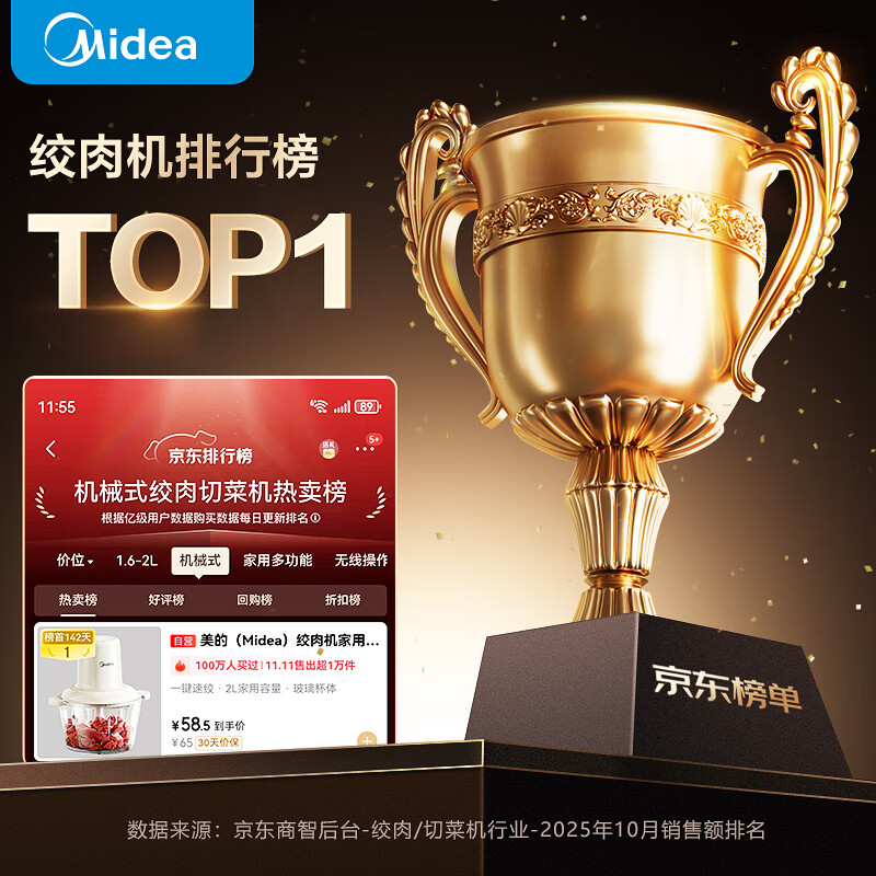 美的 绞肉机料理机辅食机不锈钢绞馅机碎肉机 双刀+匀菜杆 55B 3L 161.11元
