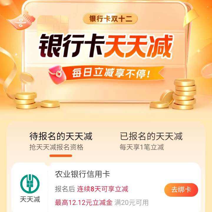 双十二支付宝银行卡天天减,报名每次至高立减12.12元
