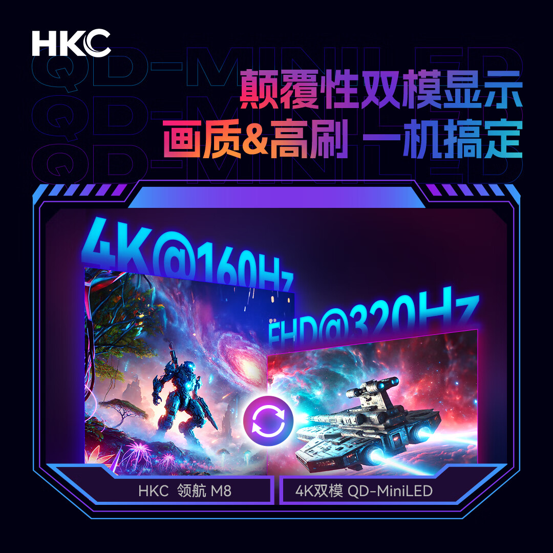 HKC G27M7Pro 27英寸MiniLED双模显示器(4K/160Hz、FHD/320Hz、100%sRGB、HDR1400、Type-C 90W) 1998.9元