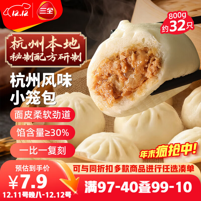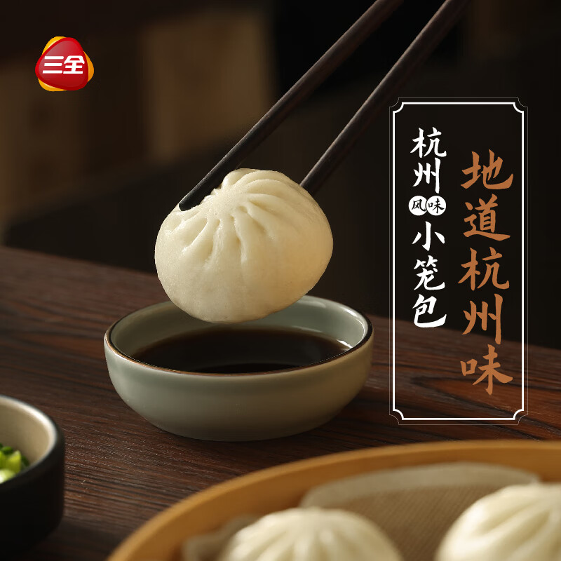 三全 杭州发面小笼包猪肉馅400g*2袋约32只 8元