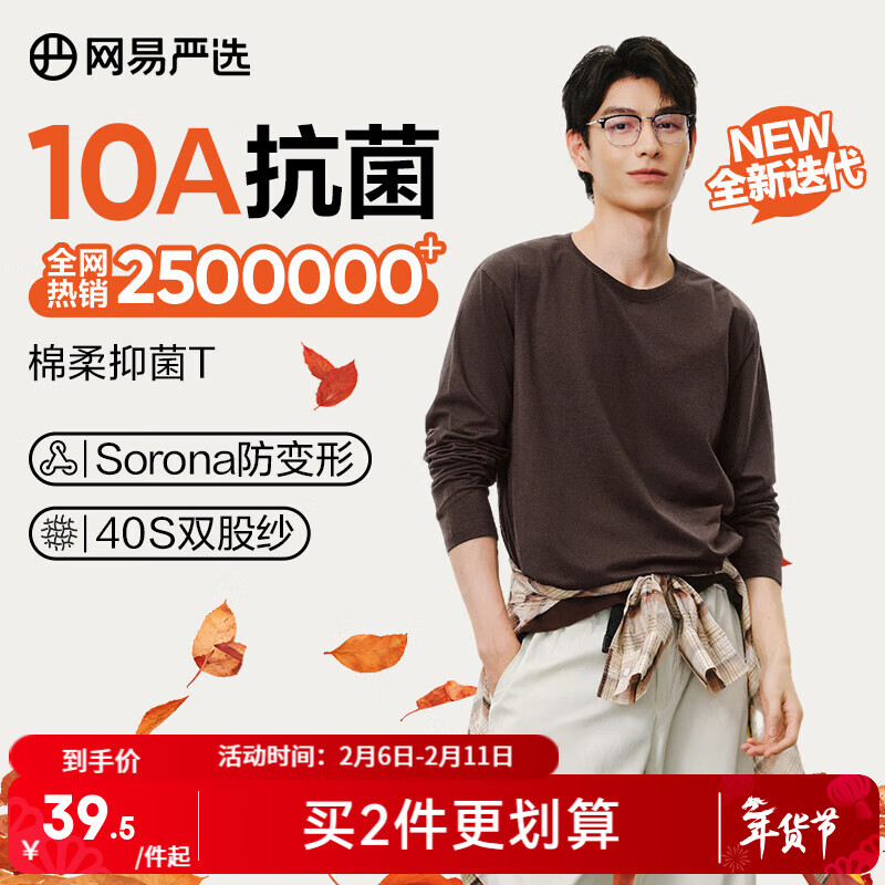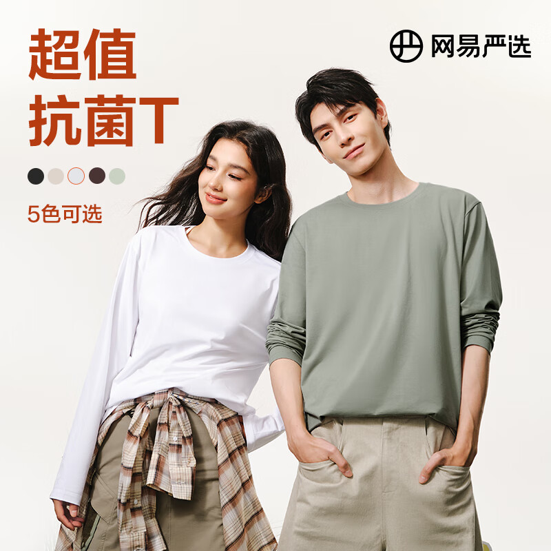 网易严选 25新疆棉长袖T恤10A抗菌万能打底衫不易变形男女同款 A款10A抑菌升级-老钱棕 L 49元