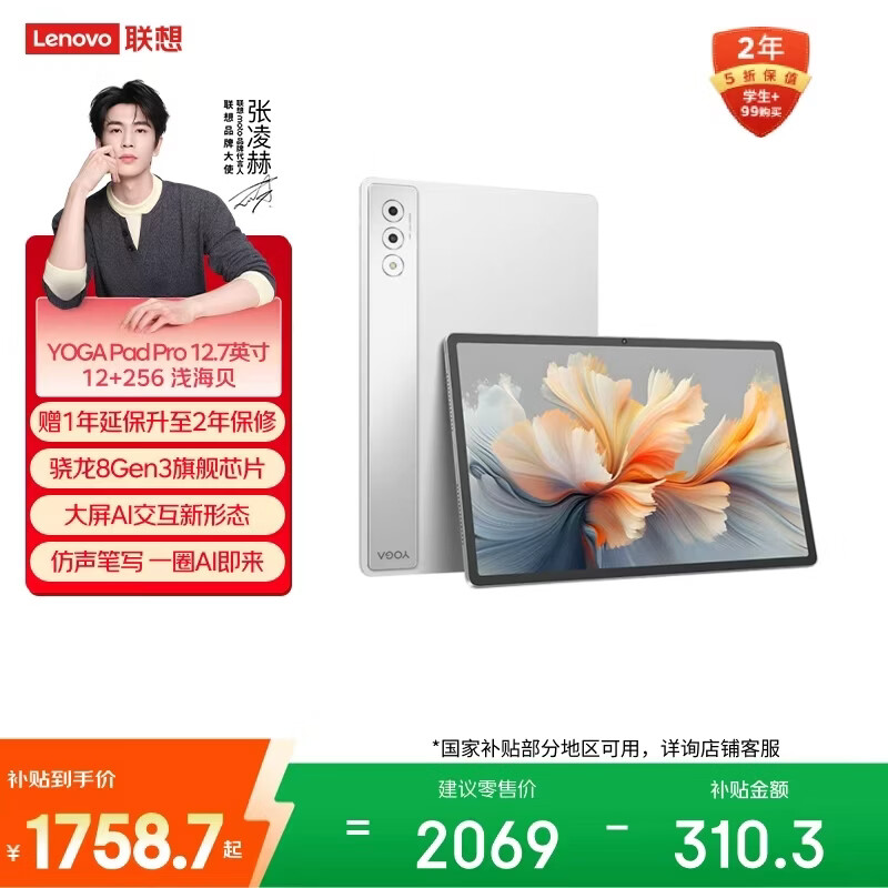 移动端、京东百亿补贴:联想 YOGA Pad Pro 12.7英寸 平板电脑(2944x1840、骁龙8 Gen3、12GB、256GB、WiFi版、雾海蓝) 1749.02元